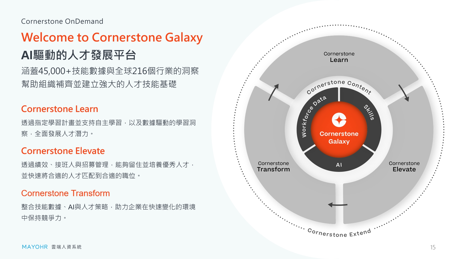 Cornerstone Galaxy平台以AI驅動 ,涵蓋Learn(學習)、Elevate(績效、招募、接班)與Transform(HR核心數據)三大模組,旨在縮小技能差距,打造敏捷的組織。