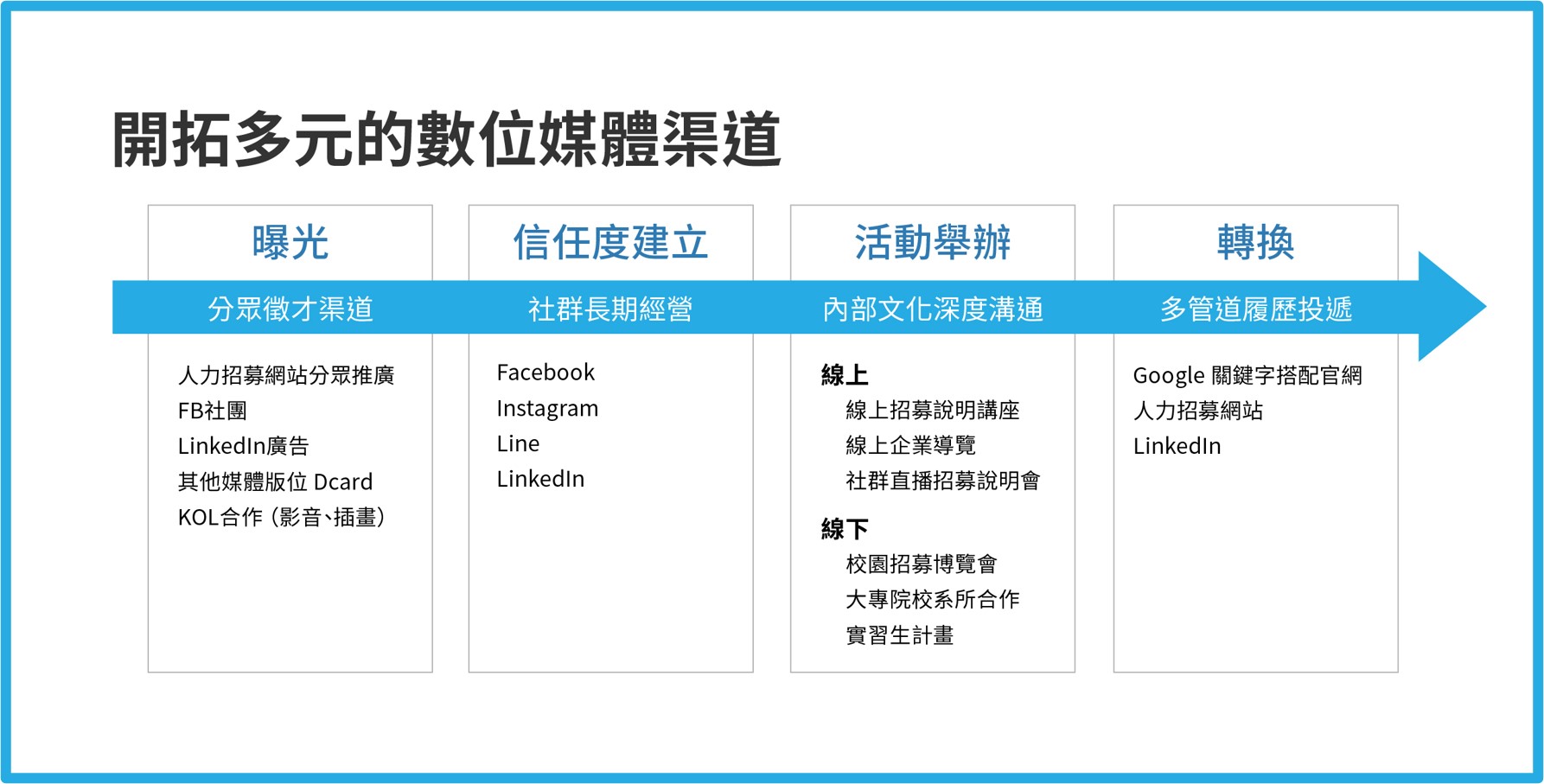 使用多種管道進行招募,除了能夠確保為公司找到最合適的人才、滿足不同職位的需求,也能透過全面觸及潛在人選進而在競爭激烈的人才市場中保持優勢。但人才不會隨便來到,因此在前期開發招募人才管道與後期訓練人才招募技巧流程十分重要。