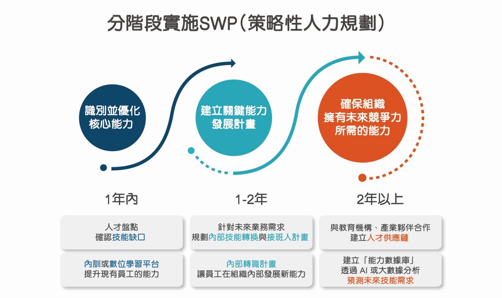 如果企業的人力資源規劃仍停留在短期「補缺」的模式,而未能提前布局技能培養與接班計畫,將導致業務運作承受更大風險。透過SWP(Strategic Workforce Planning)策略性人力規劃為起點,並搭配合適的人才發展管理工具,將人力配置從「人數管理」轉向「能力管理」,不僅關注人力需求的數量,更強調關鍵技能的質量。透過數據驅動的預測與策略性調整,確保組織能夠適應未來的業務需求與市場變化。