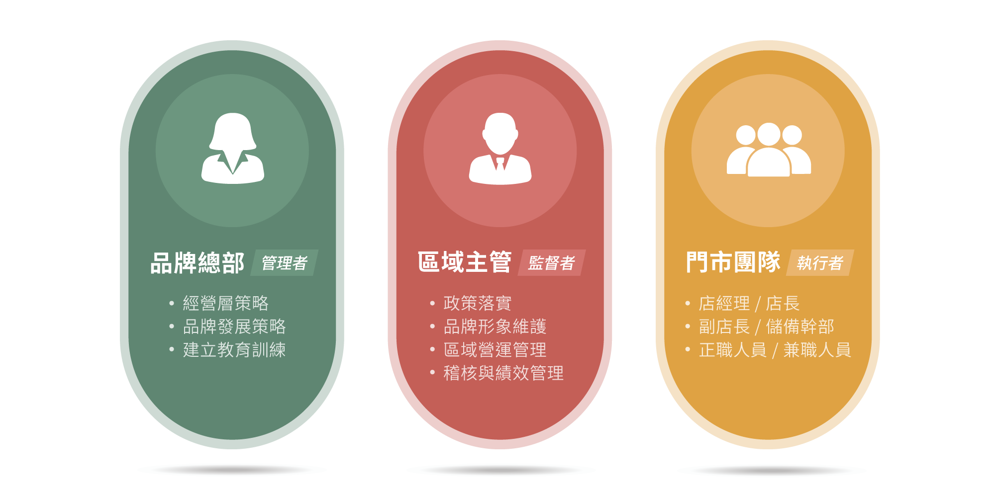 總公司(品牌總部)是核心的管理者,負責策略與建立公司整體的營運方針、品牌定位、SOP流程、KPI成效、教育制度,以確保品牌的經營。然而當門市數量逐漸增加,身為管理者該如何控制每間門市的人事成本、資源分配整合,甚至是讓每位兼職員工都能即時接收到訊息並落實執行,皆是總部會面臨的挑戰。