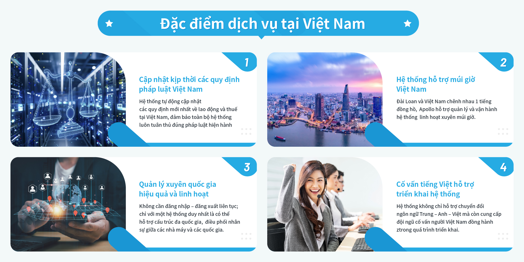 - Hệ thống hỗ trợ múi giờ Việt Nam Đài Loan và Việt Nam chênh nhau 1 tiếng đồng hồ, Apollo hỗ trợ quản lý và vận hành hệ thống linh hoạt xuyên múi giờ.